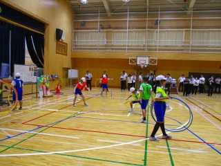 友達と協力してフープを転がしたり、くぐりぬけたりしています。